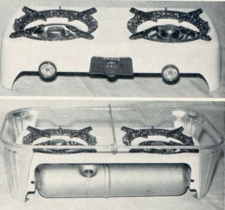 10. Den altbekannten und bewährten schwedischen Petroleum-Primuskocher gibt es seit längerem nicht nur in der hochbeinigen Form (522, 523), sondern auch in einer niedrigen Form und zweiflammig mit geräuschlosen Brennern, automatischer Düsenreinigung und Schnellzünder. Mit einer Tankfüllung brennt der Kocher etwa vier Stunden. 11. Der zweiflammige Primuskocher von hinten gesehen. Der Kocher steht in einem Schlingergestell mit verschiebbarer Querstange und Ausbuchtungen für den Pfannenstiel.