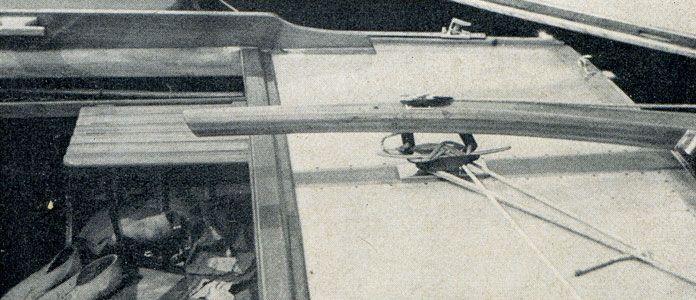 9. Hier wird die Steuerpinne durch einen kleinen, auf dem Achterdeck befestigten hochklappbaren Bügel festgesetzt, in den die Steuerpinne mit einer Ausbohrung eingehakt wird. Es ist jedoch nicht empfehlenswert, die Ruderpinne durch eine Durchbohrung zu schwächen.